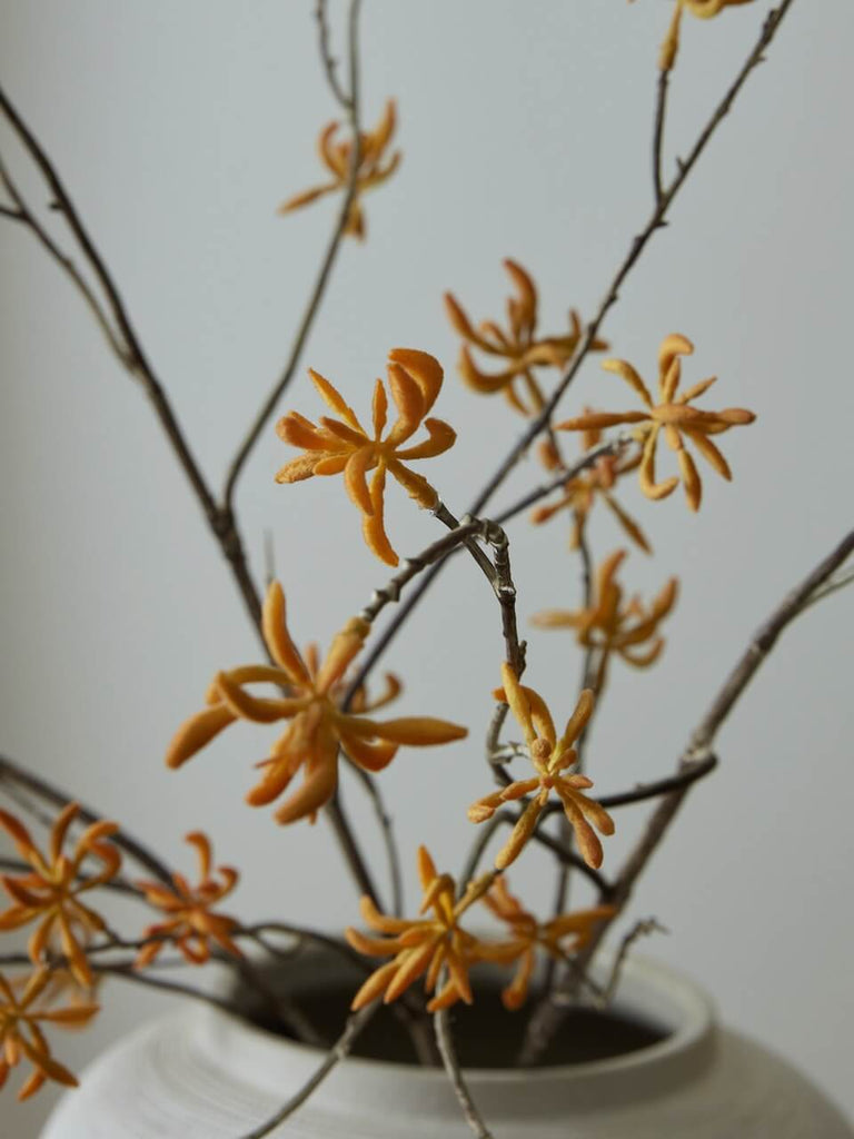 This whimsical faux kangaroo paw spray has delicate orange petals scattered throughout the very realistic looking tall branches. This faux stem has a light and airy feel yet adds a pop of colour to your display. Styled here are three stems which look beautiful on their own but this stem also makes a great addition to an existing foliage based bouquet.
