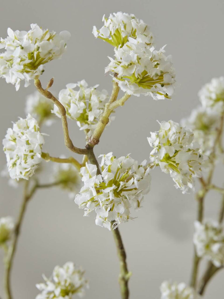 A charming blossom spray for spring, with soft bulbous heads comprising delicate petals. Shown here are three stems styled in our textured cream vase. A lovely faux bloom ideal for your Spring/Summer styling.
