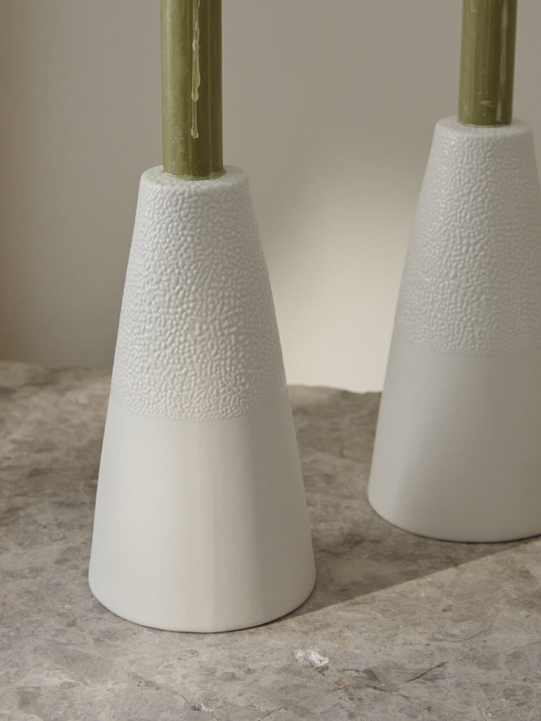 Complementing our best-selling textured tea light holders, these white ceramic candlesticks have the same beautifully textured bobble effect on them. Style along with the shorter version and the tea light holders to create a truly magical display on your table this year.