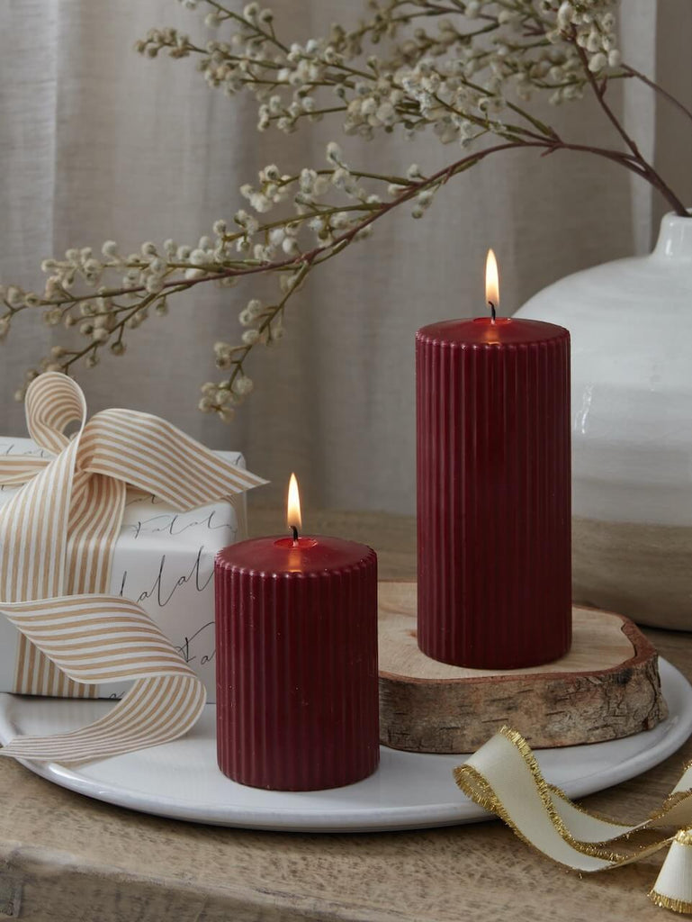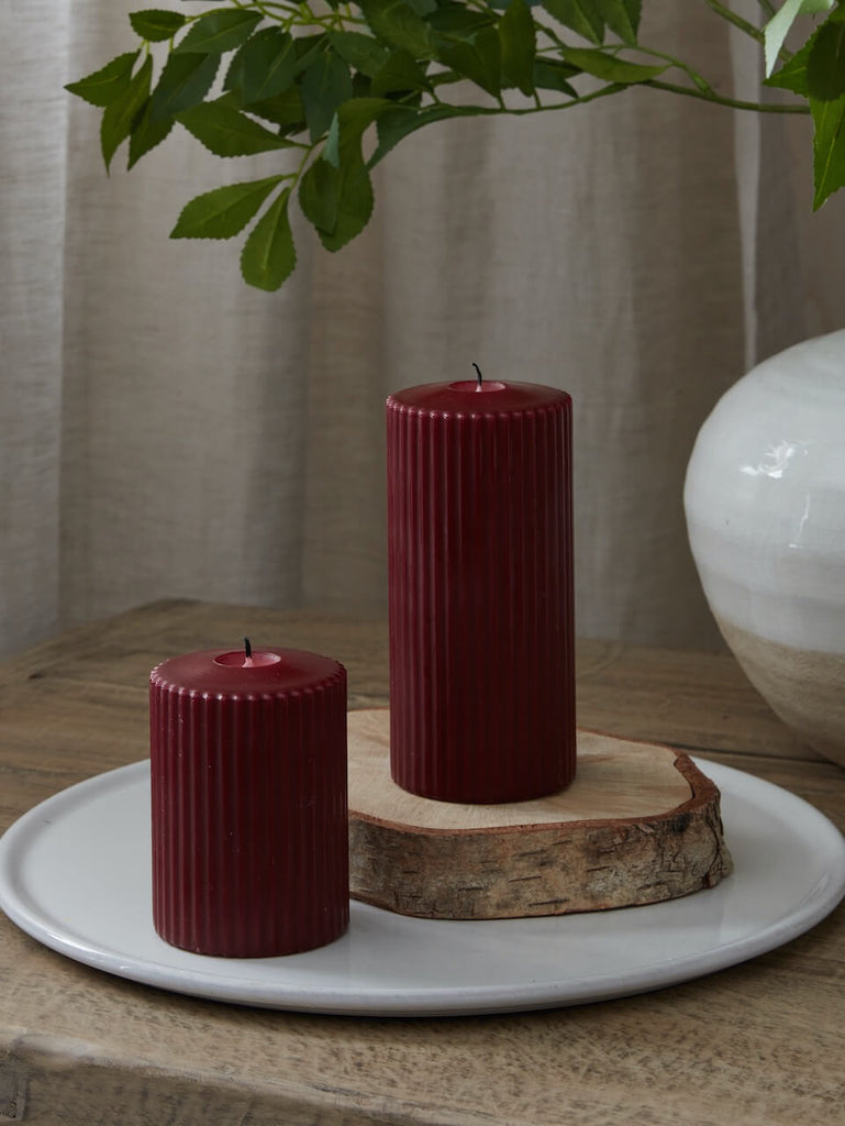 These Burgundy Ribbed Pillar Candles are a stylish way to add rich colour to your lanterns, complimenting both our brass square and brass pyramid lanterns beautifully. Sold as a set of two they are available as a set of two small or two medium size.