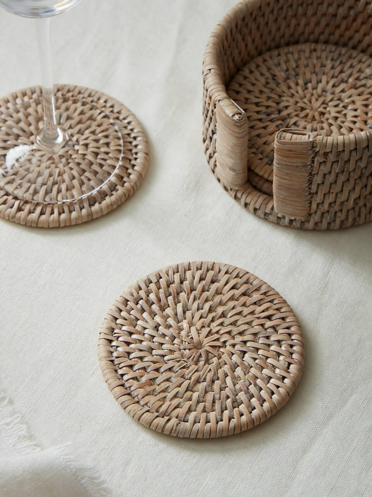 | All Products | 7577634504928 | set-of-white-rattan-coasters | Set of 6 White Rattan Coasters | Coasters, group:rattan-coasters, Rattan | true | £35.00 | Layered Lounge | Rattan |