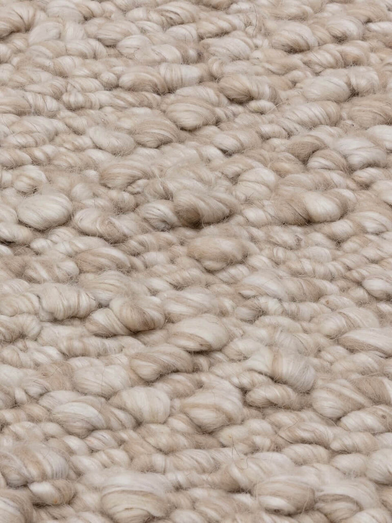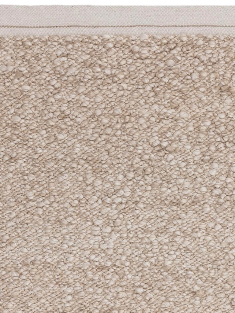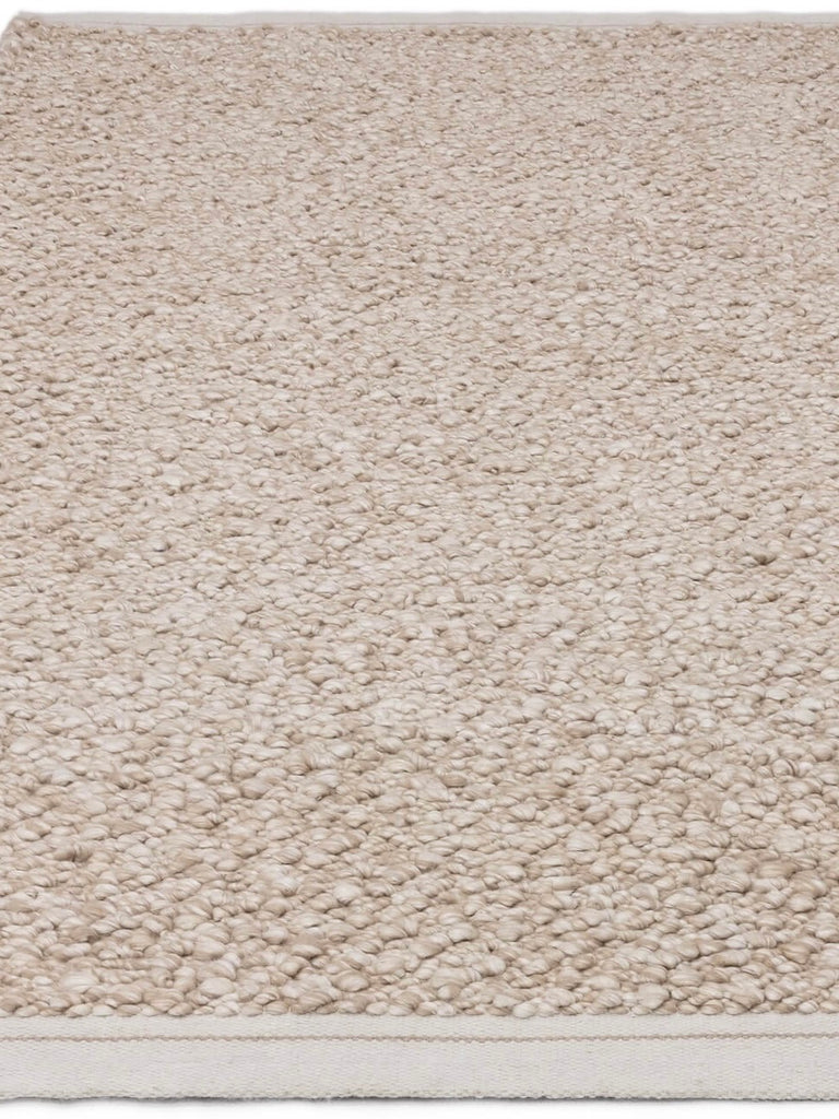 A beautifully chunky boucle style rug created using undyed natural and thick yarns. Featuring varied sized boucle weaves for added texture this rug feels absolutely fabulous and soft under your feet. Finished with a wide border with detailed stripe which adds a smart touch, this high quality rug also has a smart woven and edged back to assist with anti slip.
