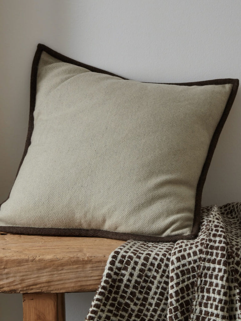 Add some texture and warmth to your sofa with this smart wool cushion of beautiful cream base edged with rich chocolate brown trim. Available in two sizes these make a perfect back drop to the rest of our patterned wool cushions.