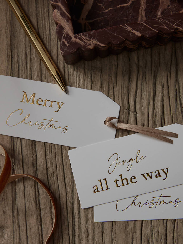 A lovely set of embossed gift tags to complement your gift wrapping this season. With a variety of festive slogans in luxury gold etching, each tag is finished off with a narrow satin gold ribbon.
